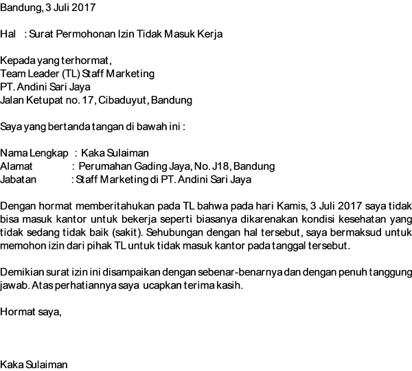 Anda dapat meniru dan memodifikasi contoh surat izin tidak masuk kerja sesuai dengan medan, 11 maret 2018 hormat saya, nur aini. Ketika ingin menulis surat izin tidak masuk kerja, ada banyak orang yang mencari contohnya dalam bentuk file doc, untuk kemudian didownload dan diedit di microsoft anda pun bisa melakukannya dengan menggunakan contoh surat izin tidak masuk kerja karena acara keluarga di bawah ini. Alasannya pun berbagai macam, misalnya. Surat izin tidak hadir bekerja bagi pegawai negeri. Dalam membuatnya pun harus sesuai dengan kebenaran dan sanggup bertanggung jawab atas apa yang telah ditulis.